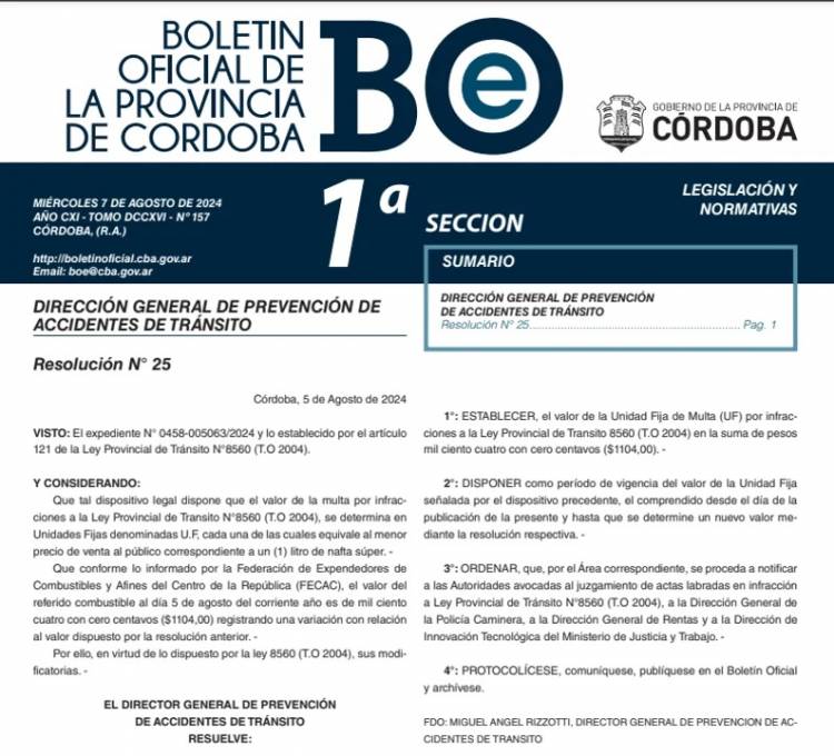 La medida se da tras el último incremento del valor del combustible, el cual es trasladado al valor de la Unidad Fija de Multa que aplica la Policía Caminera de Córdoba, el cual es similar al costo del litro de nafta Super de YPF y que desde hoy será de $ 1.104.